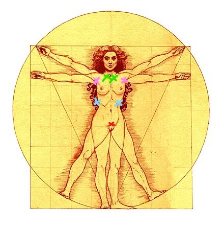The blue crosses; Right side at the bottom of the ribcage (Heart/small int/etc).